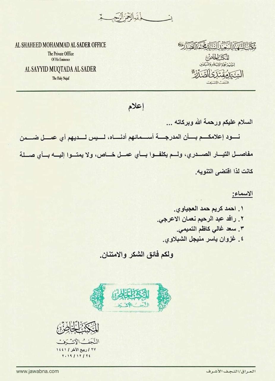 محليات يحدث الان بالوثيقة : التيار الصدري يتبريء من 4 أشخاص : ليس لديهم أي عمل ضمن مفاصلنا ولم يكلفوا بأي عمل خاص الثلاثاء, 24 ديسمبر 2019, 11:23