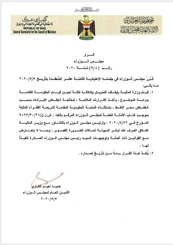 محليات يحدث الان بالوثيقة.. أمانة مجلس الوزراء توقف التمويل بأشكاله كافة وتترك قراره لحكومة الكاظمي الخميس, 7 مايو 2020, 15:06