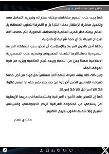 ودعا الصدر في تغريدة له على حسابه الشخصي بمنصّة “إكس”، الجميع إلى مقاطعة الكيان الصهيوني وغلق سفاراته وتجريم التعامل معه وتفعيل مذكرة الاعتقال بحق (النتن) بل و (الخرف) لتجنيب المنطقة بل العالم برمته خطر الحرب العالمية والصدامات الدموية التي حصدت آلاف الأرواح البريئة بلا أي حجة شرعية أو قانونية.