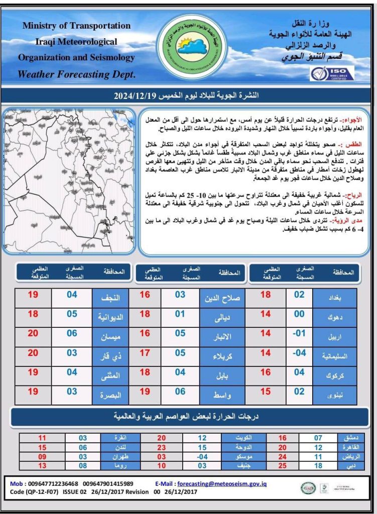 وذكر بيان للهيئة، تلقت وكالة آخر الأخبار، نسخة ، أن “غدا الجمعة سيكون الطقس غائما جزئيا إلى غائم مع تساقط زخات مطر رعدية ابتداء من الأقسام الغربية من البلاد لتشمل أغلب محافظات البلاد تدريجيا، درجات الحرارة ستنخفض قليلا في المنطقتين الوسطى والشمالية، بينما سترتفع قليلا في المنطقة الجنوبية”.
