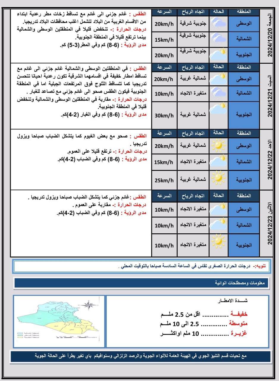 وأضاف، أن “طقس يوم السبت في المنطقتين الوسطى والشمالية سيكون غائما جزئيا إلى غائم، مع تساقط أمطار خفيفة في الأقسام الشرقية تكون رعدية أحيانا، تتحسن تدريجيا، كما يتساقط الثلج فوق المرتفعات الجبلية، أما في المنطقة الجنوبية، فسيكون الطقس صحوا إلى غائم جزئيا مع تصاعد الغبار، درجات الحرارة ستكون مقاربة لليوم السابق في المنطقتين الوسطى والشمالية، وتنخفض قليلا في المنطقة الجنوبية”.