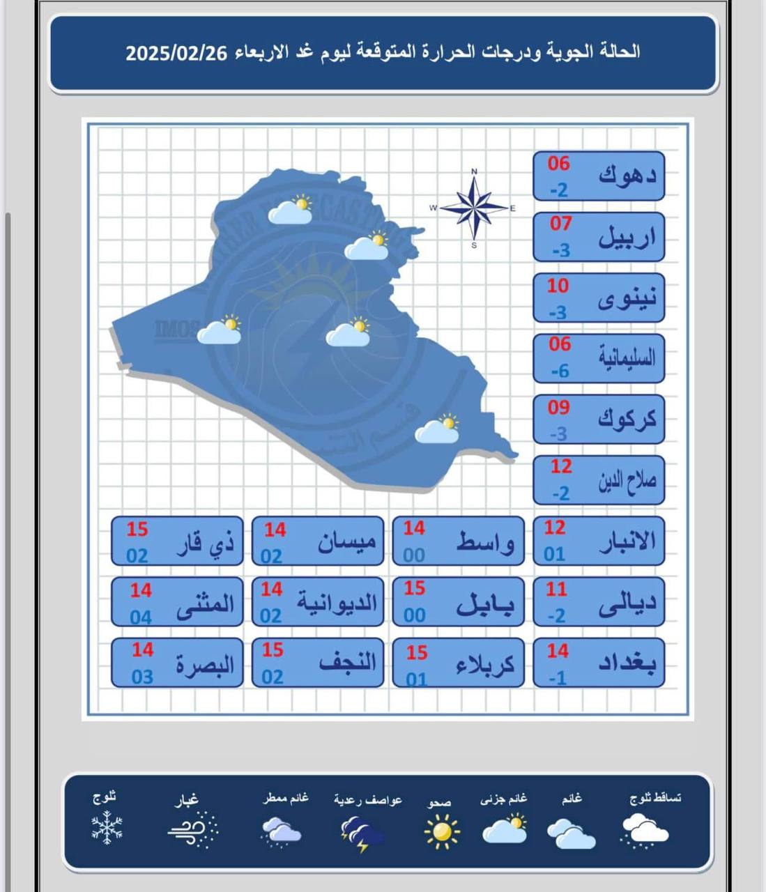 وذكر بيان للهيئة، تلقته وكالة آخر الأخبار، أن “الطقس غداً الأربعاء سيكون غائماً جزئياً إلى غائم، يتحول ليلاً إلى صحو في المنطقتين الوسطى والشمالية، مع درجات حرارة مقاربة لليوم السابق”، مبيناً أن “درجات الحرارة العظمى ليوم غدٍ الأربعاء ستكون كما يلي: بغداد والبصرة والديوانية والمثنى وميسان وواسط 14، وكربلاء والنجف وبابل وذي قار 15، وصلاح الدين والأنبار 12، ونينوى 10، والسليمانية ودهوك 6، وأربيل 7”.