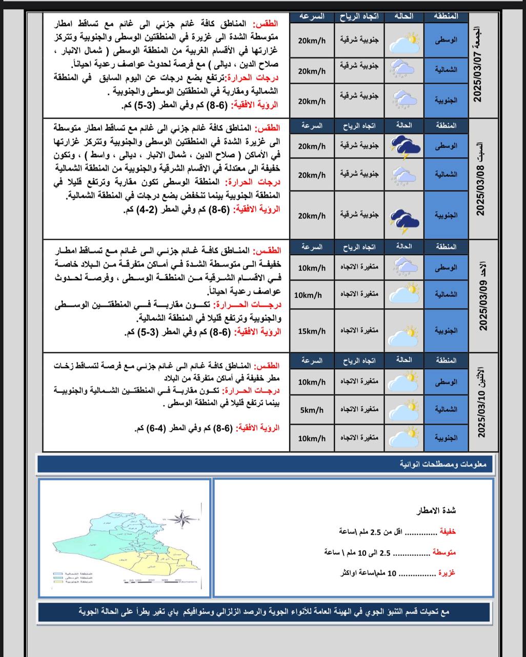 وأضاف، أن “يوم السبت سيكون الطقس غائماً جزئياً الى غائم مع تساقط امطار متوسطة الى غزيرة الشدة في المنطقتين الوسطى والجنوبية وتتركز غزارتها في الأماكن ( صلاح الدين ، شمال الانبار ، ديالي ، واسط ) ، وتكون خفيفة الى معتدلة في الاقسام الشرقية والجنوبية من المنطقة الشمالية، درجات الحرارة المنطقة في الوسطى تكون مقاربة وترتفع قليلا في المنطقة الجنوبية بينما تنخفض بضع درجات في المنطقة الشمالية، الرؤية الافقية (6-8) كم وفي المطر (2-4) كم”.