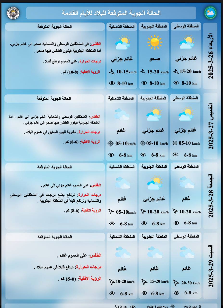 وأشارت الهيئة في بيانها إلى أن البلاد ستشهد استقراراً نسبياً في الطقس خلال الأيام المقبلة، مع استمرار الارتفاع التدريجي في درجات الحرارة، خصوصاً في المناطق الوسطى والجنوبية.