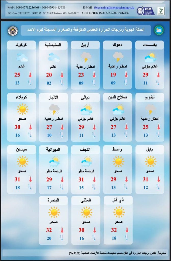 منخفض جوي مع امطار رعدية مصحوب ببرق ورعد الأحد, 13 أبريل 2025, 9:53 محليات, يحدث الان أعلنت هيئة الأنواء الجوية عن منخفض جوي قادم، يصاحبه تساقط أمطار متفاوتة الشدة، بالإضافة إلى عواصف رعدية وبرق، ويشمل هذا المنخفض معظم أو جميع مدن البلاد. تابعونا عبر تليغرام