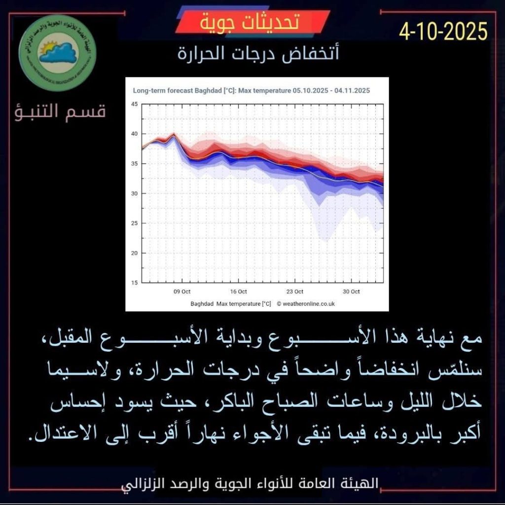 وأضافت، أن “هذا التغير التدريجي سيدفع المواطنين إلى ترك وسائل التبريد جانباً، والاستعداد تدريجياً لاستقبال أجواء أكثر برودة تسبق الشتاء، الذي يُتوقع أن يبدأ فعلياً مع دخول شهر تشرين الثاني (نوفمبر)”.