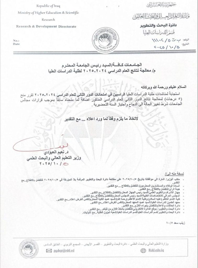 وجاء في وثيقة صادرة من الوزارة وتلقتها وكالة (اخر الاخبار): إنه “تمت الموافقة على منح 5 درجات معالجة لطلبة الدراسات العليا الراسبين بالدور الثاني للعام الدراسي 2024 – 2025”.
