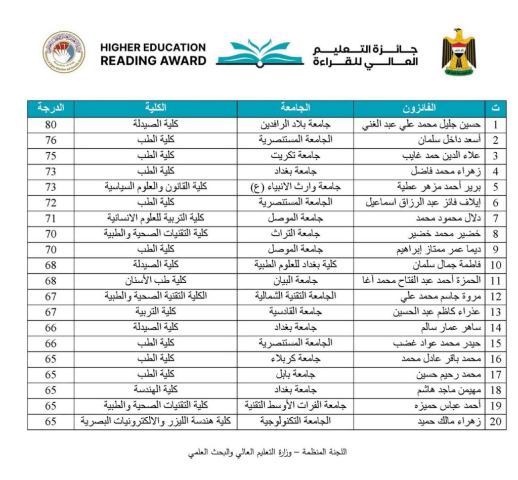 أعلنت وزارة التعليم العالي والبحث العلمي نتائج جائزة التعليم العالي للقراءة بنسختها الثالثة لعام 2025، مؤكدة أن المسابقة الثقافية والفكرية حققت أهدافها في الجامعات العراقية.