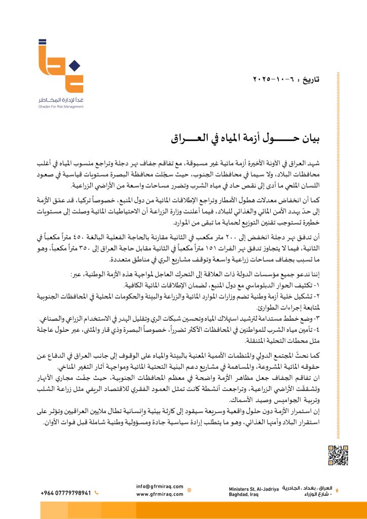 حذّرت مؤسسة غداً لإدارة المخاطر من تفاقم أزمة المياه في العراق، مؤكدين أنها باتت تشكّل تهديدًا مباشرًا للأمن الوطني والغذائي في البلاد، مشيرة إلى أن استمرار انخفاض منسوب الأنهار وتراجع الإيرادات المائية من دول الجوار يهددان الزراعة والإنتاج الحيواني ويزيدان من وتيرة النزوح الداخلي.