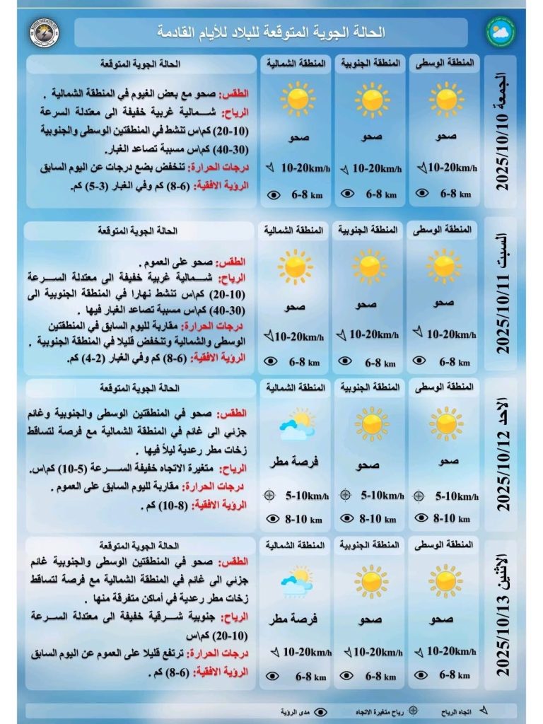 الأنواء الجوية: طقس صحو وانخفاض تدريجي بدرجات الحرارة مع فرص أمطار شمالاً الخميس, 9 أكتوبر 2025, 9:07 محليات, يحدث الان توقعت هيئة الأنواء الجوية، اليوم الخميس ، أن يكون الطقس في البلاد صحواً إلى غائم جزئياً خلال الأيام المقبلة، مع انخفاض تدريجي في درجات الحرارة وفرص لتساقط زخات مطر رعدية في بعض المناطق الشمالية. تابعونا عبر تليغرام
