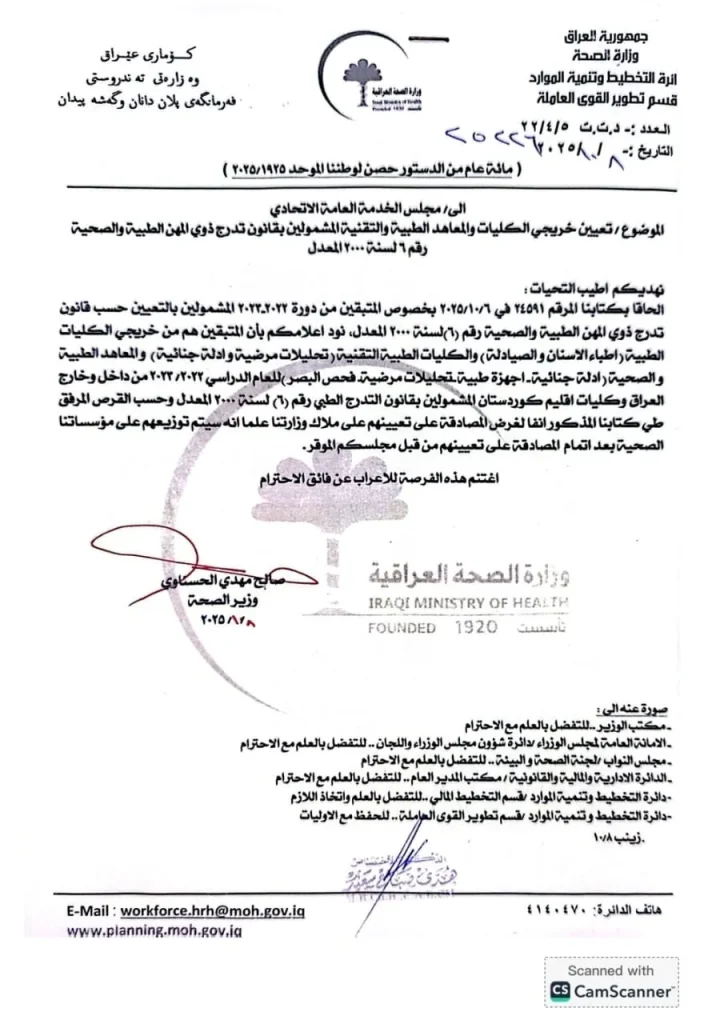 وزارة الصحة تخاطب مجلس الخدمة لتعيين خريجي الكليات والمعاهد الطبية والتقنية الخميس, 9 أكتوبر 2025, 9:02 محليات, يحدث الان خاطبت وزارة الصحة، اليوم الخميس، مجلس الخدمة العامة الاتحادي لتعيين خريجي الكليات والمعاهد الطبية والتقنية المشمولين بقانون تدرج ذوي المهن الطبية والصحية. تابعونا عبر تليغرام