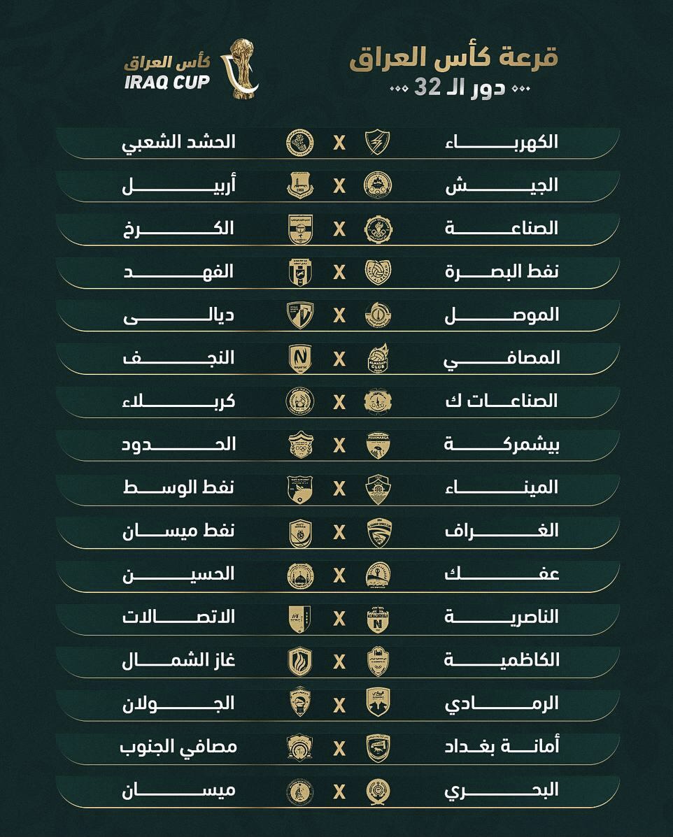 بعدها أجريت عمليةُ القرعةِ، وأسفرت مباريات الدور 32 من كأس العراق عن المواجهات الآتية: