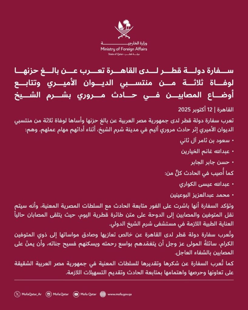 قطر تعلن رسميا مصرع ثلاث من موظفيها في حادث ” شرم الشيخ ” .. بيان من سفارتها في القاهرة
