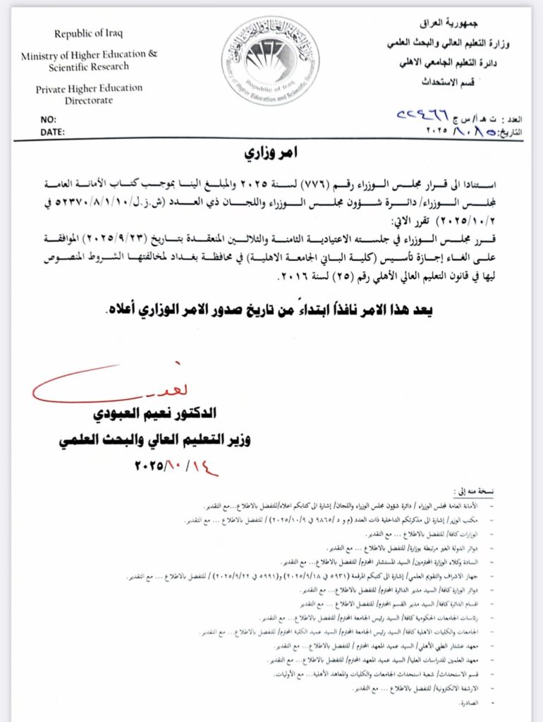 أصدر وزير التعليم العالي والبحث العلمي نعيم العبودي أمراً وزارياً يقضي بإلغاء إجازة تأسيس كلية الباني الجامعة الأهلية في محافظة بغداد.
