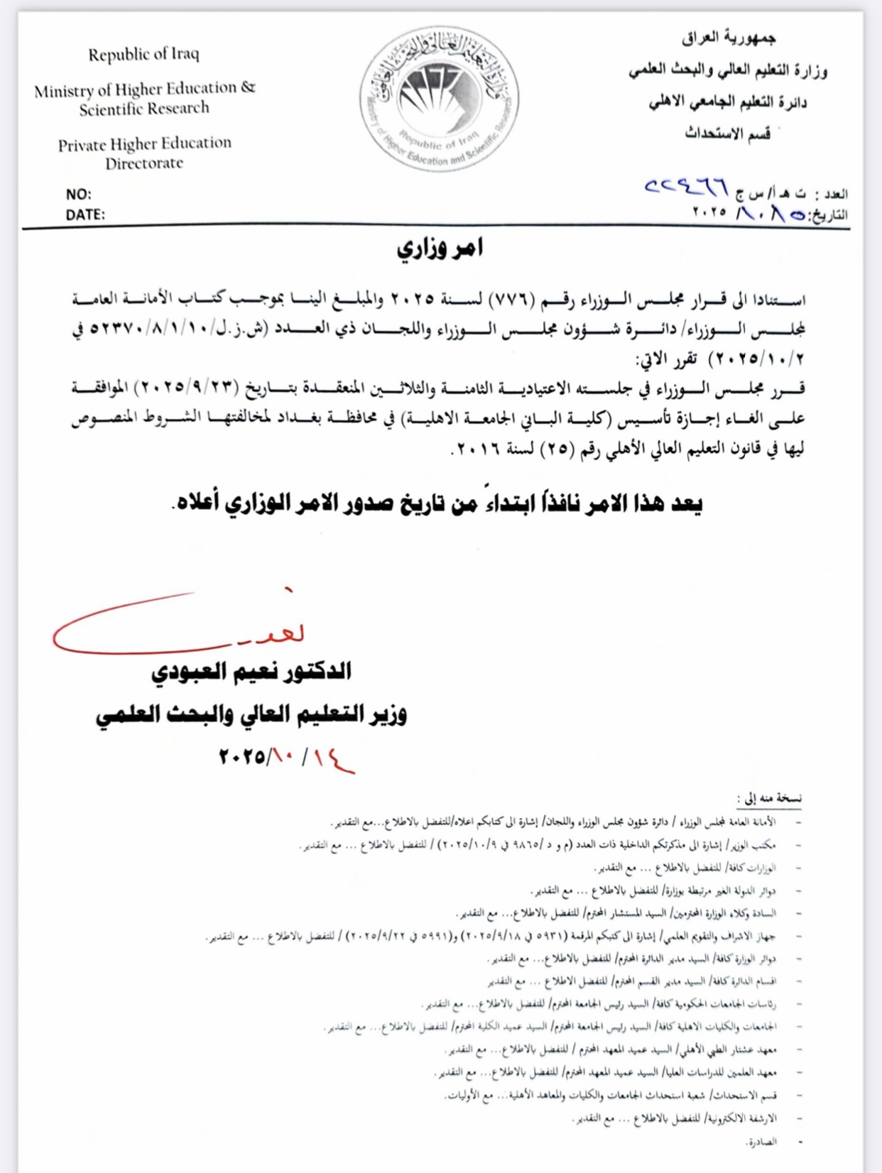 وجاء في نص الأمر الوزاري أن مجلس الوزراء قرر في جلسته الاعتيادية الثامنة والثلاثين المنعقدة بتاريخ 23 أيلول 2025، الموافقة على إلغاء إجازة تأسيس كلية الباني الجامعة الأهلية لمخالفتها الشروط والضوابط المنصوص عليها في قانون التعليم العالي الأهلي رقم (25) لسنة 2016.