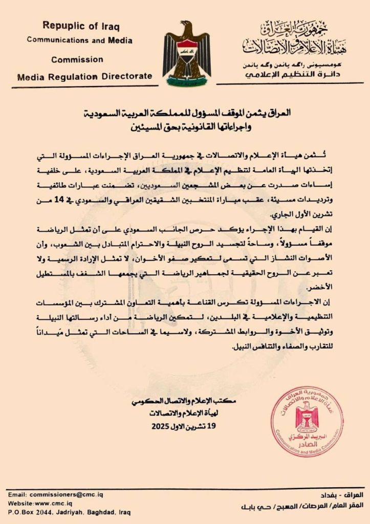 ثمنت هيأة الإعلام والاتصالات في العراق، الإجراءات المسؤولة التي اتخذتها الهيئة العامة لتنظيم الإعلام في المملكة العربية السعودية بحق المشجعين الذين صدرت عنهم إساءات عقب مباراة المنتخبين العراقي والسعودي بتاريخ 14 تشرين الأول.