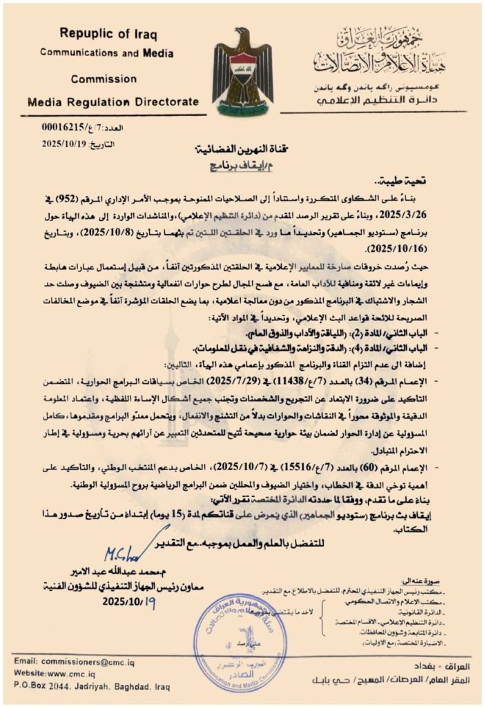 وجهت هيئة الاعلام والاتصالات ، إنذارًا إلى قناة النهرين الفضائية بعد رصد خروقات في إحدى حلقات برنامج “ستديو الجماهير” الذي بُث بتاريخ (8 تشرين الأول 2025)، مؤكدة أهمية الالتزام بالضوابط المهنية في العمل الإعلامي، والحرص على ترسيخ خطاب وطني مسؤول بعيد عن التحريض والتجريح.
