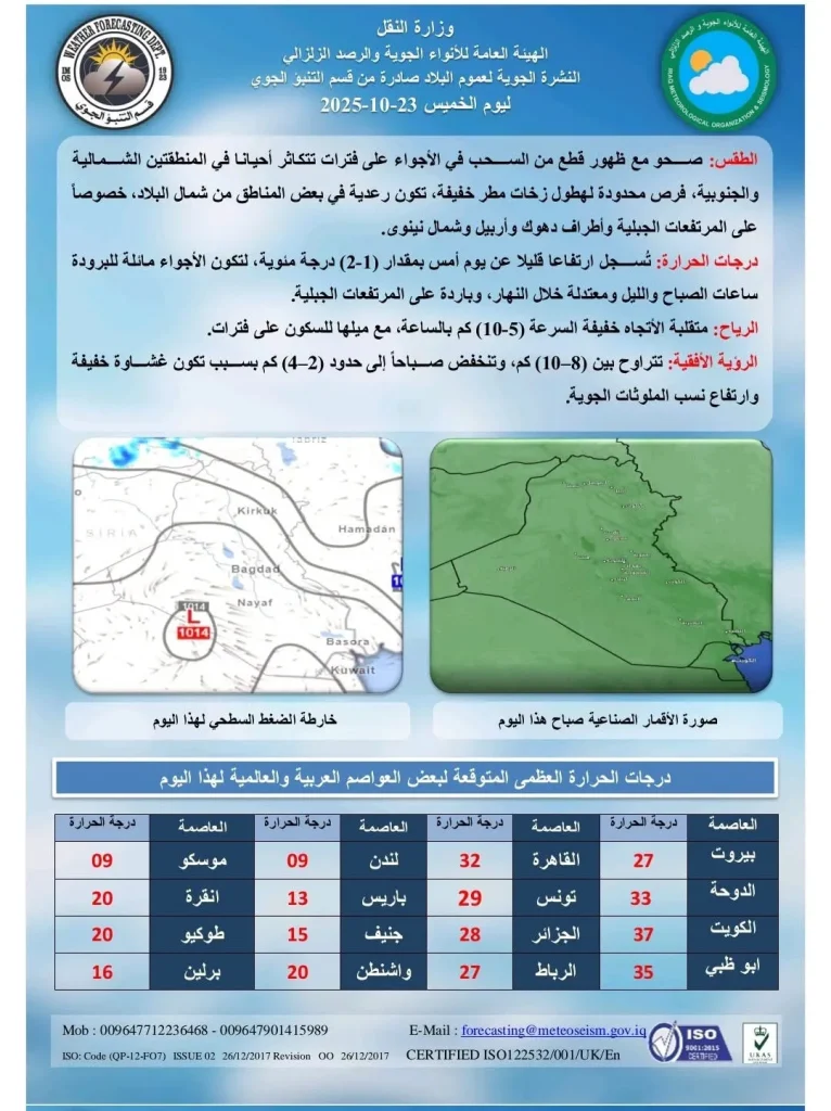الانواء الجوية .. ارتفاع بسيط بدرجات الحرارة مع فرص محدودة لهطول الامطار شمالا الخميس, 23 أكتوبر 2025, 9:59 محليات, يحدث الان توقعت هيئة الأنواء الجوية، أن يكون طقس العراق صحواً إلى غائم جزئي وارتفاع قليل في درجات الحرارة في بعض المناطق، مع فرص محدودة لتساقط الأمطار الخفيفة في مناطق متفرقة شمال البلاد . تابعونا عبر تليغرام