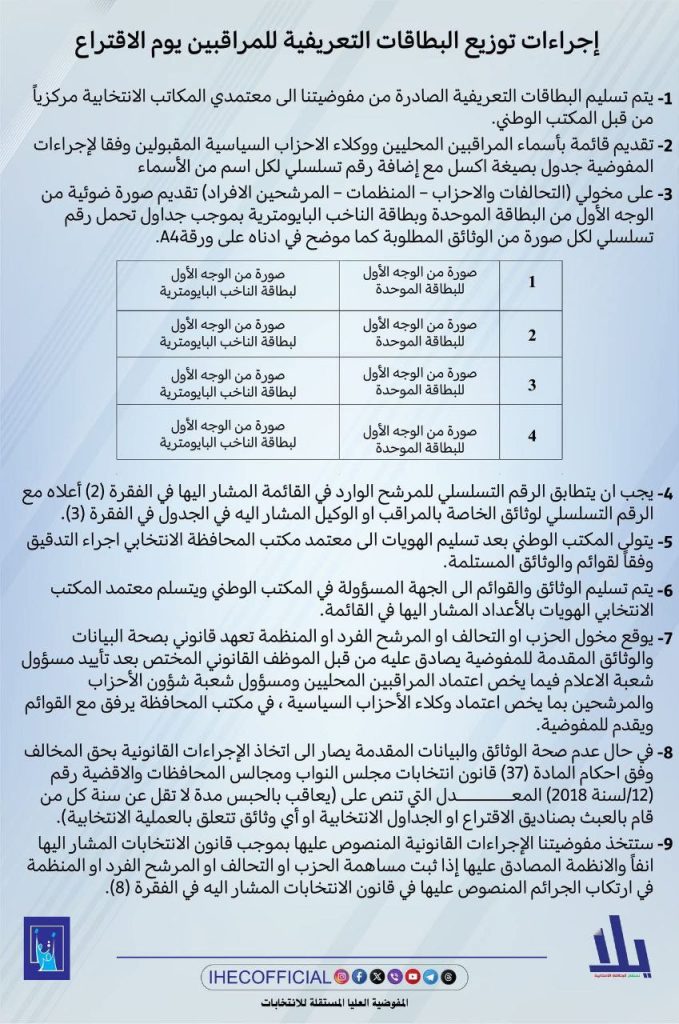 وذكرت المفوضية في بيان تلقته وكالة آخر الأخبار، أن توزيع البطاقات سيتم وفق آلية محددة لتسهيل دخول المراقبين إلى مراكز ومحطات الاقتراع، مشيرة إلى أن التفاصيل الكاملة الخاصة بالإجراءات مبيّنة في الوثيقة الرسمية الصادرة عنها.
