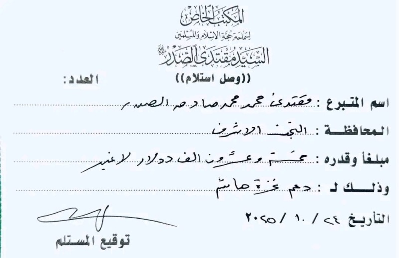 السيد الصدر يبدأ حملة جمع الأموال لغـ ـزة بالتبرع بـ 25 ألف دولار الجمعة, 24 أكتوبر 2025, 13:39 محليات, يحدث الان تبرع زعيم التيار الوطني الشيعي، مقتدى الصدر، اليوم الجمعة (24 تشرين الاول 2025)، بمبلغ 25 الف دولار لحملة اعمار غزة. واظهرت وثيقة تلقتها ” اخر الاخبار “، تبرع الصدر بالمبلغ لاعادة اعمار غزة هاشم. تابعونا عبر تليغرام