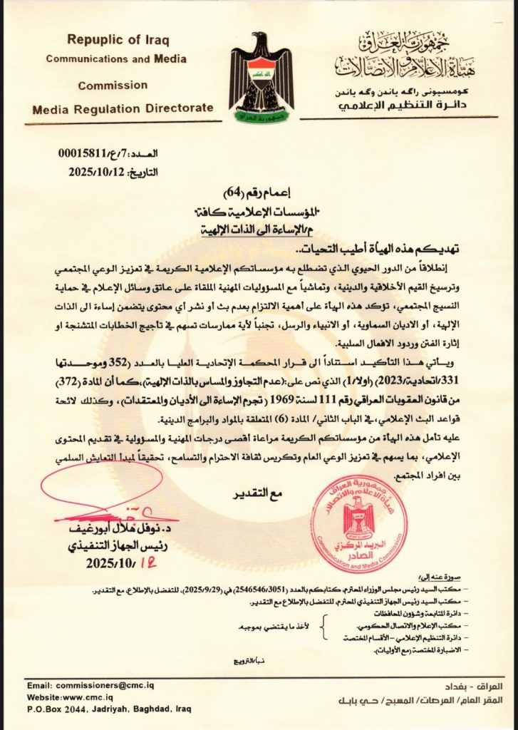وذكرت الهيئة في بيان تلقته ” اخر الاخبار ” نسخة منه ، أن هذا التأكيد يأتي استناداً إلى قرار المحكمة الاتحادية العليا بالعدد (352) وموحدتها (331/اتحادية/2023)، والذي نص على عدم التجاوز أو المساس بالذات الإلهية، فضلاً عن المادة (372) من قانون العقوبات العراقي رقم (111) لسنة 1969 التي تُجرّم الإساءة إلى الأديان والمعتقدات، وكذلك لائحة قواعد البث الإعلامي في الباب الثاني / المادة (6) الخاصة بالمواد والبرامج الدينية.