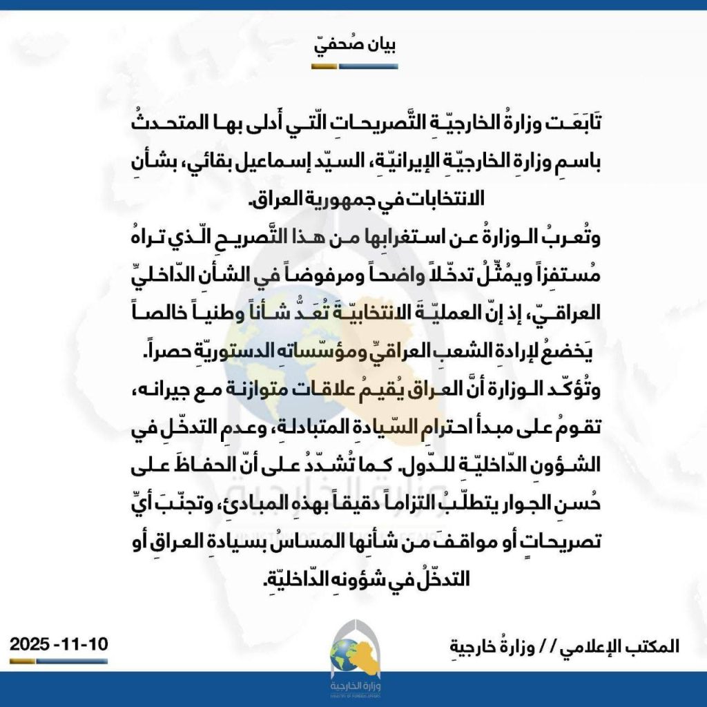 وأضاف البيان، أن “الوزارة تُعربُ عن استغرابِها من هذا التصريحِ الّذي تراهُ مُستفِزاً ويُمثِّلُ تدخّلاً واضحاً ومرفوضاً في الشأنِ الدّاخليِّ العراقيّ، إذ إن العمليّةَ الانتخابيّةَ تُعَدُّ شأناً وطنياً خالصاً يَخضعُ لإرادةِ الشعبِ العراقيِّ ومؤسّساتهِ الدستوريّةِ حصراً”.