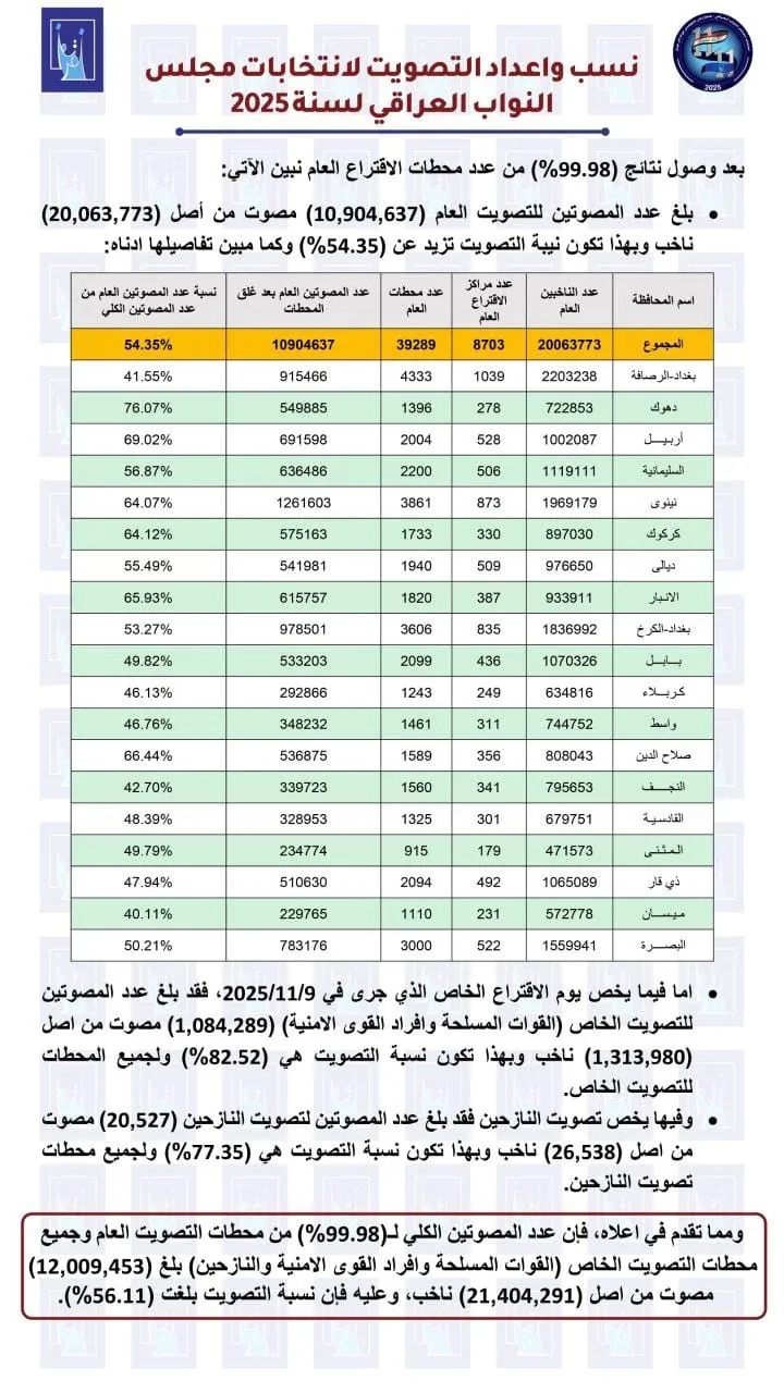 (اخر الاخبار) تنشر نسب وأعداد التصويت لانتخابات مجلس النواب الأربعاء, 12 نوفمبر 2025, 15:41 محليات, يحدث الان تنشر (اخر الاخبار)، اليوم الأربعاء، نسب وأعداد التصويت في انتخابات مجلس النواب 2025 وأكدت المفوضية بحسب تقريرها “ارتفاع نسبة التصويت في الانتخابات البرلمانية إلى 56.11 بالمئة”. تابعونا عبر تليغرام
