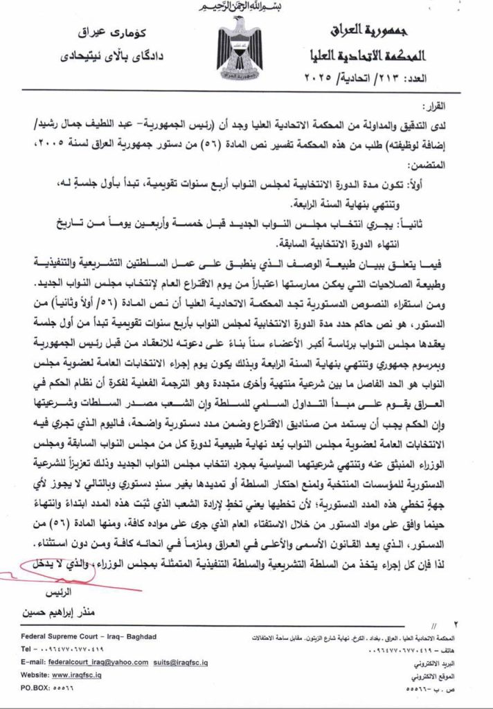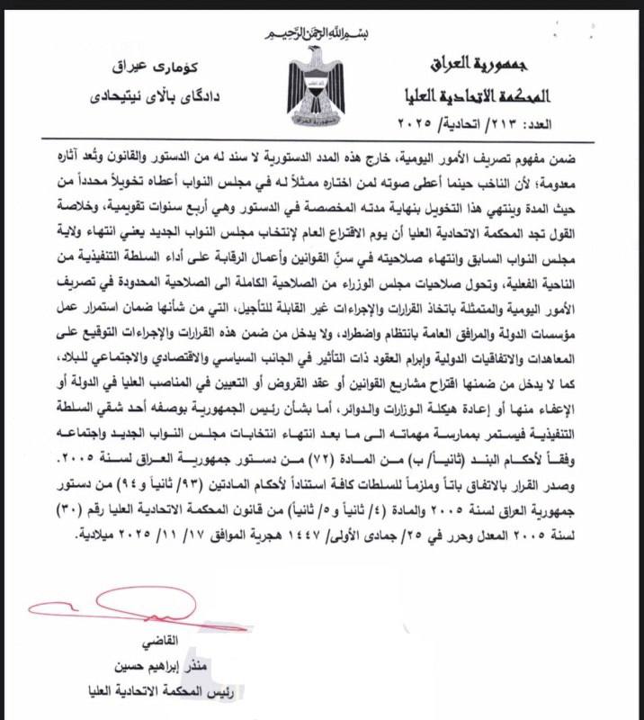 بالوثائق .. المحكمة الاتحادية تؤكد انتهاء ولاية مجلس النواب وتحول صلاحيات مجلس الوزراء إلى تصريف الأمور اليومية