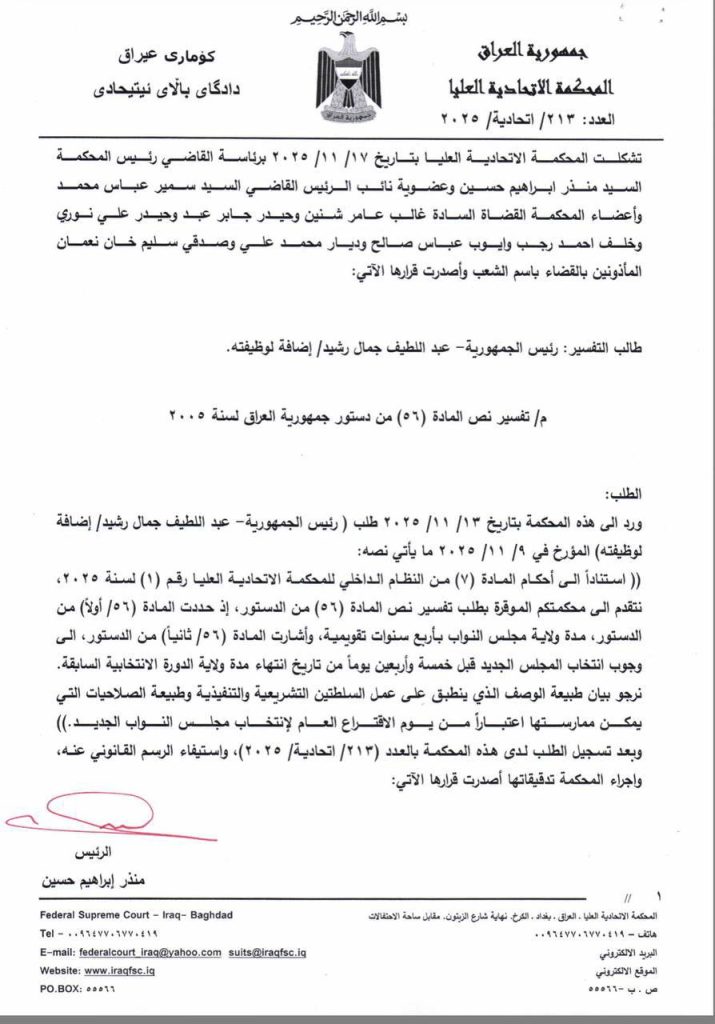 وقالت المحكمة في بيان تلقته وكالة ” اخر الاخبار ” إن ” المحكمة الاتحادية العليا، عقدت اليوم جلستها برئاسة منذر إبراهيم حسين وبحضور كامل الأعضاء من القضاة وأصدرت قرارها التفسيري بالعدد ( 213 / اتحادية / 2025 ) في 17 / 11 / 2025، بناء على طلب رئيس الجمهورية الخاص بتفسير المادة (56) من دستور جمهورية العراق لعام 2005، وتضمن القرار التفسيري المبادئ التالية: