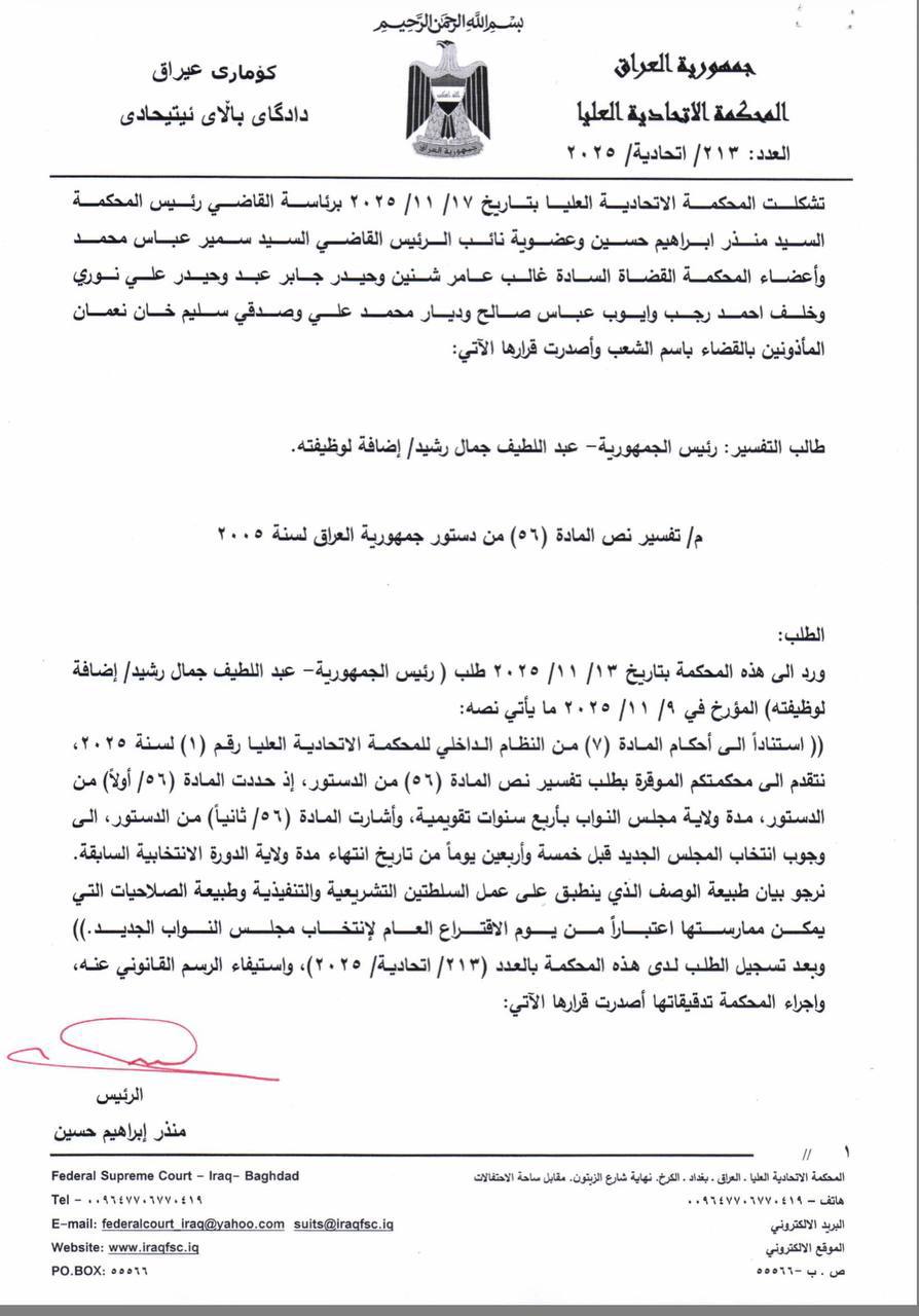 وقالت المحكمة في بيان تلقته وكالة ” اخر الاخبار ” إن ” المحكمة الاتحادية العليا، عقدت اليوم جلستها برئاسة منذر إبراهيم حسين وبحضور كامل الأعضاء من القضاة وأصدرت قرارها التفسيري بالعدد ( 213 / اتحادية / 2025 ) في 17 / 11 / 2025، بناء على طلب رئيس الجمهورية الخاص بتفسير المادة (56) من دستور جمهورية العراق لعام 2005، وتضمن القرار التفسيري المبادئ التالية: