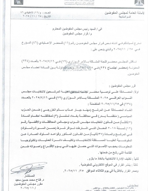 أظهرت وثيقة صادرة عن المفوضية العليا المستقلة للانتخابات بتاريخ، اليوم الثلاثاء (25 تشرين الثاني 2025)، قرارا يقضي باستبعاد المرشح الفائز “مهند الخزرجي” بانتخابات تشرين 2025 لعدم توفر شرط “حسن السيرة والسلوك”.