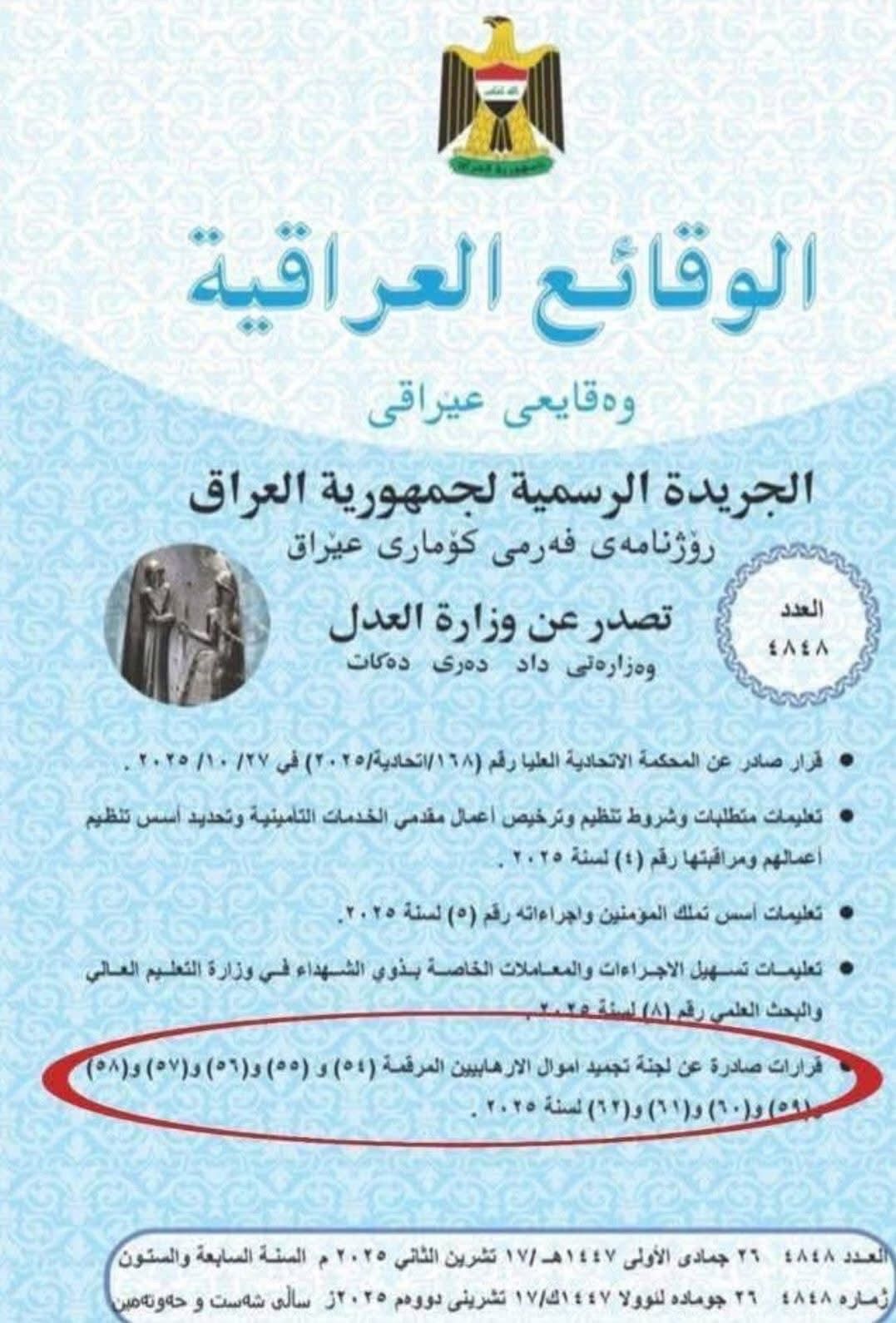أدرجت الحكومة العراقية- لجنة تجميد أموال الإرهابيين، حزب الله اللبناني، وجماعة “أنصار الله- الحوثيين” في اليمن على قوائمها، تنفيذاً لحزم من قرارات مجلس الأمن الخاصة بمكافحة الإرهاب وتمويله، وذلك بحسب ما ورد في العدد 4848 من جريدة الوقائع العراقية الصادر في 17 تشرين الثاني 2025