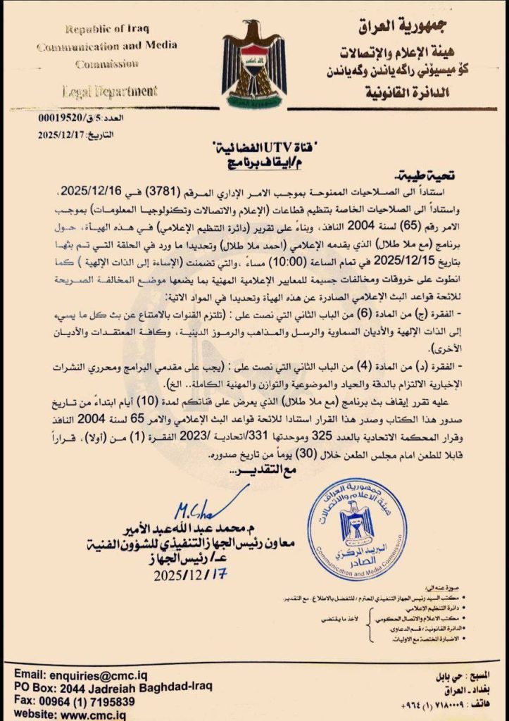 هيئة الإعلام والاتصالات: إيقاف برنامج مع ملا طلال على قناة UTV لمدة 10 أيام