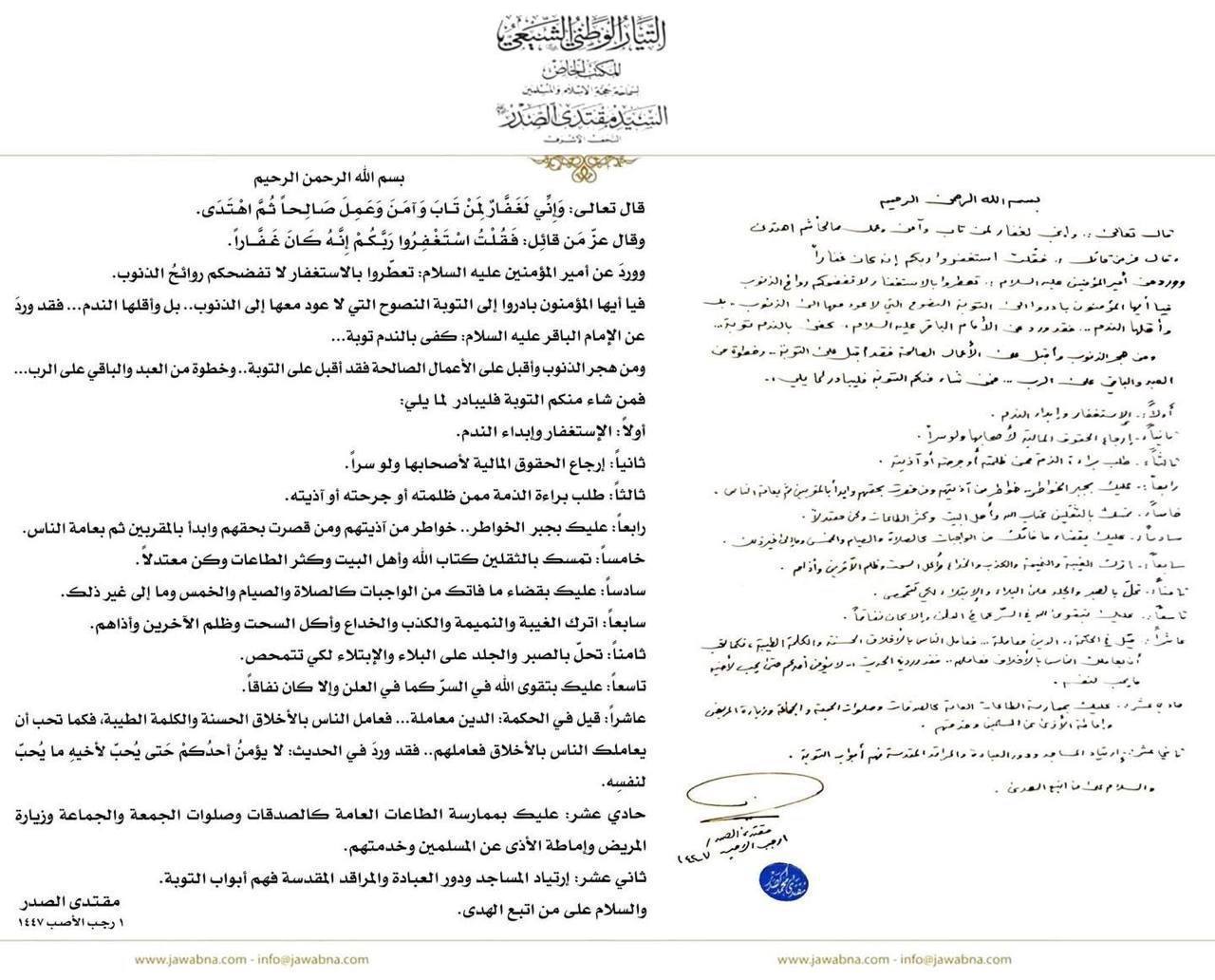 أصدر زعيم التيار الوطني الشيعي مقتدى الصدر، اليوم الأحد ( 21 كانون الأول 2025 )، بيانًا دعا فيه المؤمنين إلى التوبة النصوح والعمل الصالح، مشددًا على أهمية الاستغفار وترك الذنوب، والحرص على أداء الواجبات الدينية والاجتماعية.