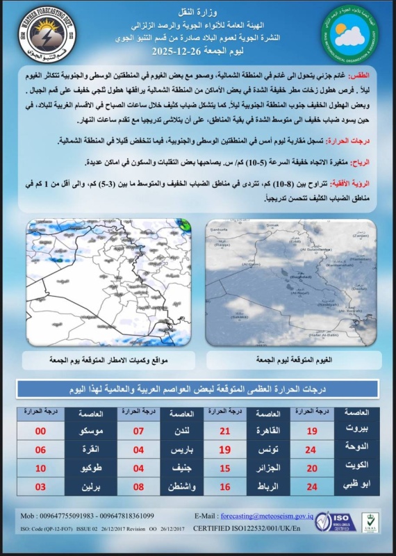 توقعت الهيئة العامة للأنواء الجوية، اليوم الجمعة ( 26 كانون الأول 2025 )، أن الطقس في العراق سيكون غائماً جزئياً يميل للغائم مع فرص أمطار خفيفة شمالاً وتساقط ثلجي خفيف على الجبال، وصحواً مع بعض الغيوم وسطاً وهطول خفيف جنوباً في الليل. كما يتشكل ضباب صباحي يزول تدريجياً، مع استقرار درجات الحرارة أيضا في هذه المناطق.
