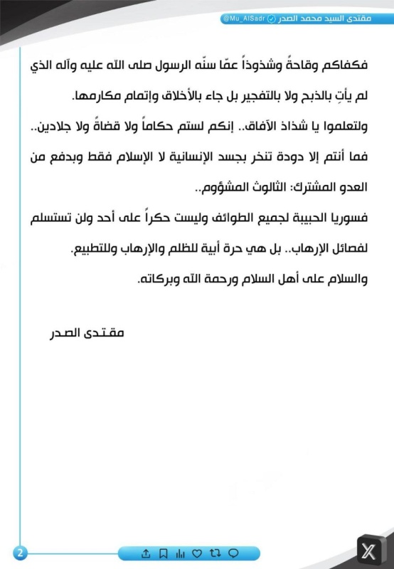 السيد الصدر يعلق على حادثة تفجير مسجد الامام علي ويوجه رسالة لحكومة سوريا الجمعة, 26 ديسمبر 2025, 22:04 سياسة, يحدث الان نعى زعيم التيار الوطني الشيعي مقتدى الصدر، اليوم الجمعة ( 26 كانون الأول 2025 )، شهداء التفجير الذي استهدف مسجد الإمام علي في مدينة حمص السورية، محذراً من تداعيات خطيرة قد تقود إلى حرب طائفية جديدة. تابعونا عبر تليغرام