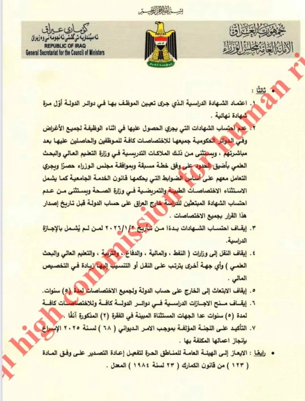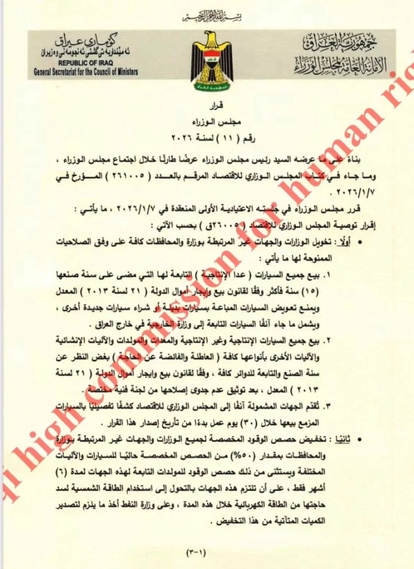 تنشر ” اخر الاخبار ” وثيقة رسمية صادرة عن الأمانة العامة لمجلس الوزراء، تتضمّن حزمة إجراءات لترشيد الإنفاق في مؤسسات الدولة، من بينها بيع السيارات الحكومية القديمة العائدة للوزارات والجهات غير المرتبطة بوزارة والمحافظات، وتقليص حصص الوقود المخصّصة لتلك الجهات بنسبة تصل إلى 50٪، وإيقاف دراسة الموظفين على نفقة الدولة خارج العراق، واعتماد الشهادة الدراسية التي جرى التعيين على أساسها، إضافة إلى تخصيص أرض في المنطقة الكمركرية الوسطى لصالح الهيئة العامة للمناطق الحرّة لإكمال عمليات إعادة تصدير المركبات.