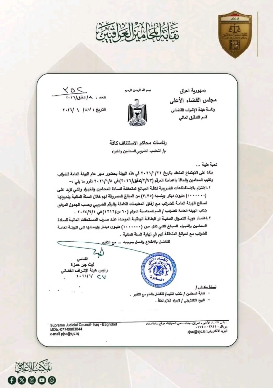 وبحسب وثيقة رسمية، نشرتها نقابة المحامين العراقيين، اطلعت عليها ” اخر الاخبار “، قررت السلطة القضائية استقطاع نسبة 2.5% من مبالغ أتعاب المحامين المنتدبين أمام المحاكم، وتحويل المبالغ المستقطعة إلى الهيئة العامة للضرائب، في إطار تنظيم عملية التحاسب الضريبي وتعزيز موارد الخزينة العامة.