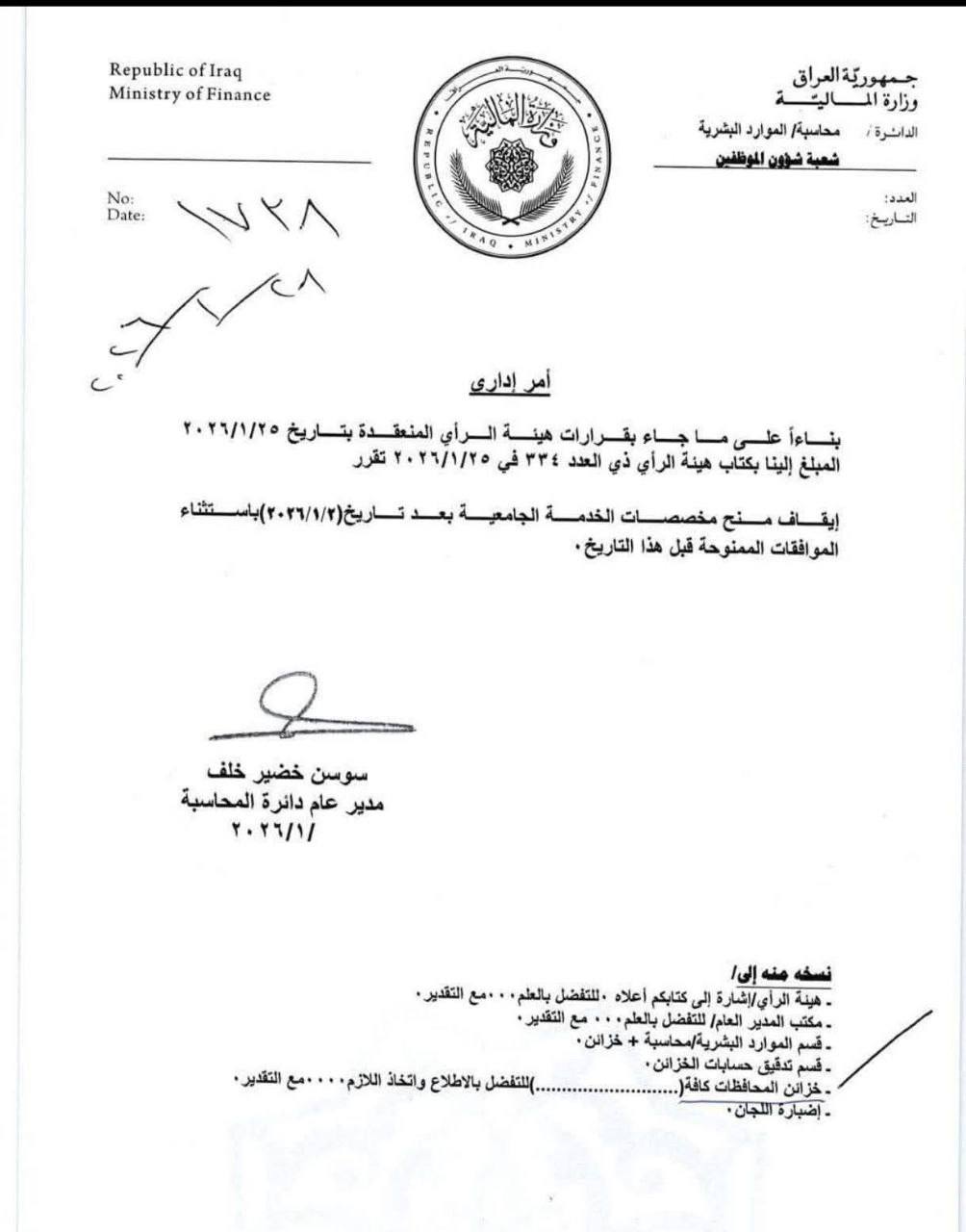 وبحسب وثيقة صادرة بتاريخ (28 كانون الثاني 2026)، بناءَ على ما جاء بقرارات هيئة الرأي المنعقدة بتاريخ 2026/1/25 المبلغ إلينا بكتاب هيئة الرأي ذي العدد 334 في 2026/1/25 تقرر إيقاف منح مخصصات الخدمة الجامعية بعد تاريخ (2026/1/2) باستثناء الموافقات الممنوحة قبل هذا التاريخ”.
