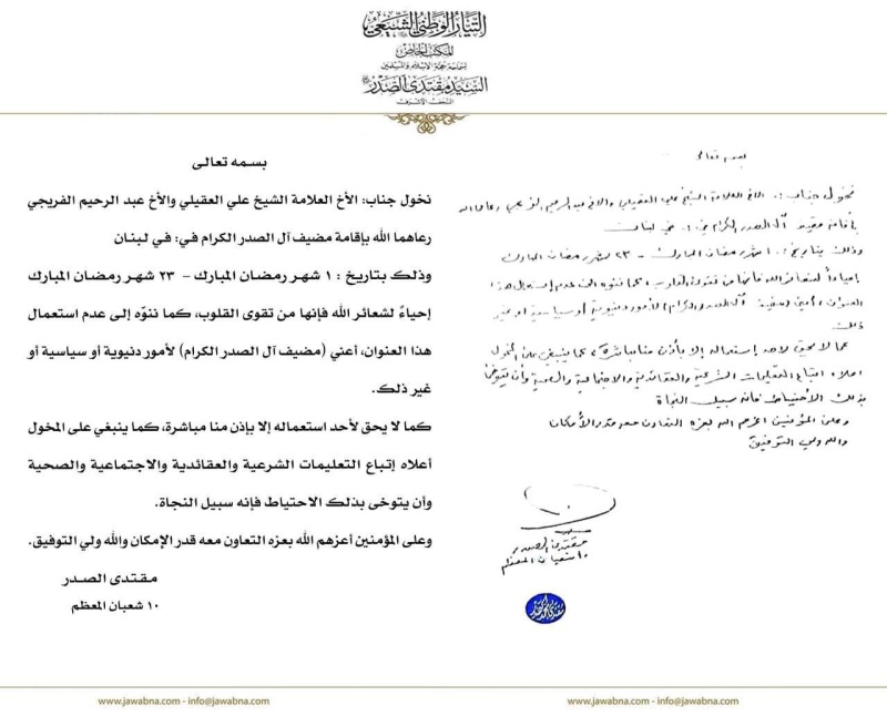 وكلف الصدر بحسب بيان لمكتبه، تلقته ” اخر الاخبار “، علي العقيلي وعبد الرحيم الفريجي بإقامة المضيف في لبنان من 1 الى 23 من شهر رمضان القادم.