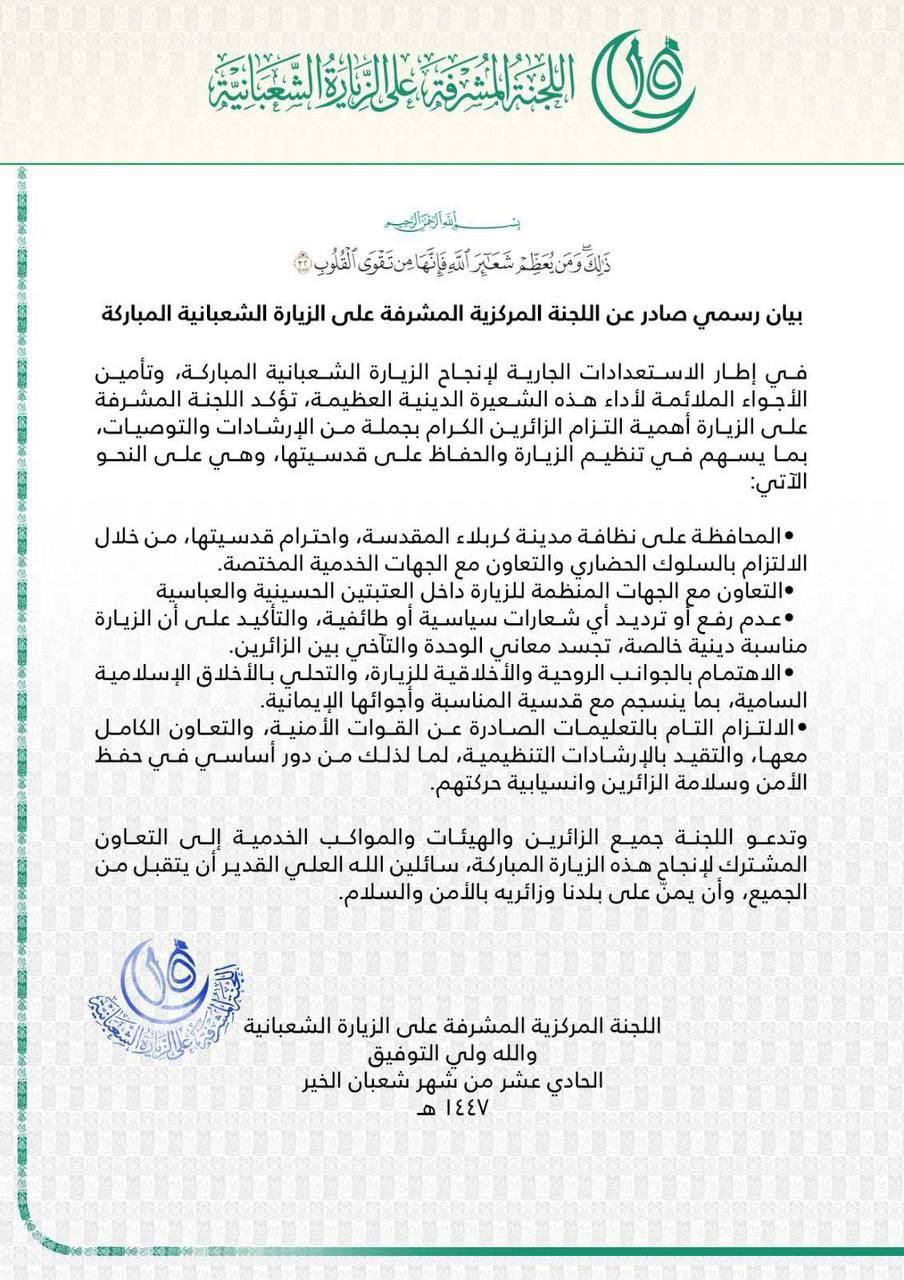 أصدرت اللجنة المركزية المشرفة على الزيارة الشعبانية، اليوم السبت، مجموعة من الإرشادات والتوصيات الخاصة بالزيارة.