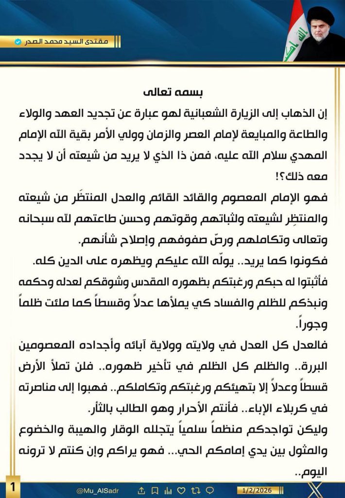 السيد الصدر بشأن الزيارة الشعبانية: جموعكم المليونية قد تكون سبباً في الظهور العظيم للإمام المهدي الأحد, 1 فبراير 2026, 1:16 محليات, يحدث الان أصدر زعيم التيار الوطني الشيعي، السيد مقتدى الصدر، تعليقاً بشأن الزيارة الشعبانية. تابعونا عبر تليغرام