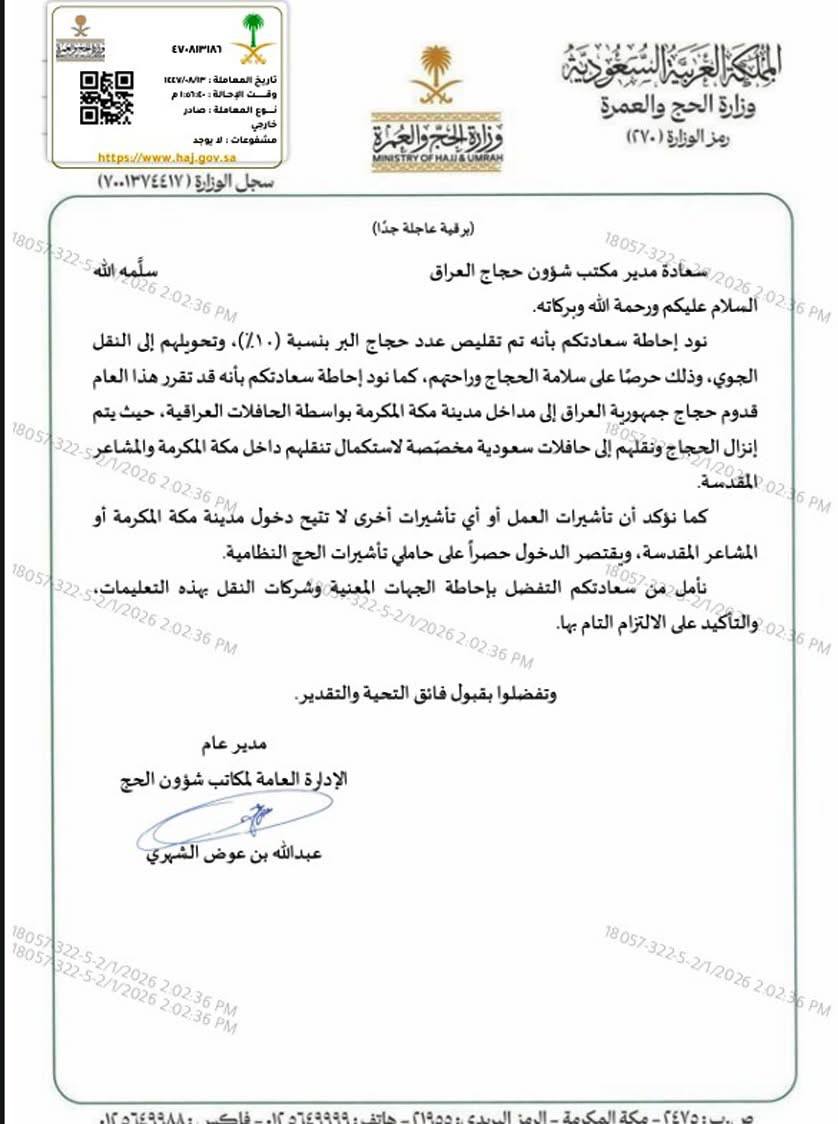 بالوثيقة.. السعودية تقلص نسبة حجاج العراق وتمنع دخول حافلاتهم الأحد, 1 فبراير 2026, 18:12 محليات, يحدث الان قررت وزارة الحج والعمرة في السعودية منع دخول حافلات البر خلال موسم الحج المقبل 1447 هجرية في هذا العام الميلادي 2026. كما قررت السلطات السعودية حصة العراق في حج 2026 بنسبة 10%. تابعونا عبر تليغرام