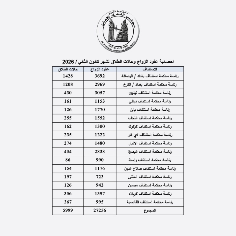 أعلن مجلس القضاء الاعلى، اليوم الثلاثاء ( 17 شباط 2026 )، عدد حالات الزواج والطلاق في البلاد خلال شهر كانون الثاني المنصرم.