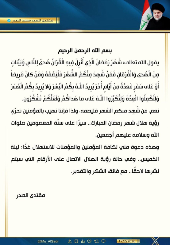 السيد الصدر يدعو لتحري هلال شهر رمضان مساء يوم غد الأربعاء الثلاثاء, 17 فبراير 2026, 23:50 محليات, يحدث الان دعا زعيم التيار الوطني الشيعي، السيد مقتدى الصدر، اليوم الثلاثاء، كافة للاستهلال مساء غد الأربعاء تحرياً لرؤية هلال شهر رمضان المبارك. وتنشر ” اخر الاخبار “، نص تغريدة الصدر بشأن الاستهلال، وكما وردت أدناه: تابعونا عبر تليغرام