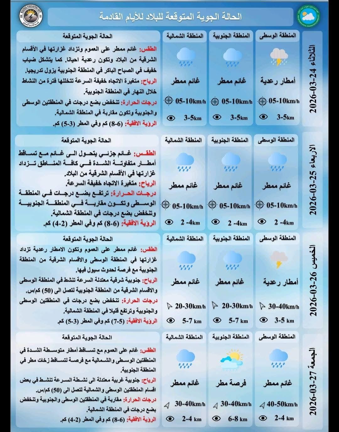 أمطار رعدية وانخفاض بالحرارة.. تقلبات جوية تضرب العراق في الأيام المقبلة الإثنين, 23 مارس 2026, 11:36 محليات, يحدث الان تشهد البلاد خلال الأيام المقبلة حالة من عدم الاستقرار الجوي، تتسم بهطول أمطار متفاوتة الشدة مصحوبة بعواصف رعدية في بعض المناطق، مع انخفاض ملحوظ في درجات الحرارة ونشاط في الرياح، خاصة في المناطق الوسطى والجنوبية. تابعونا عبر تليغرام