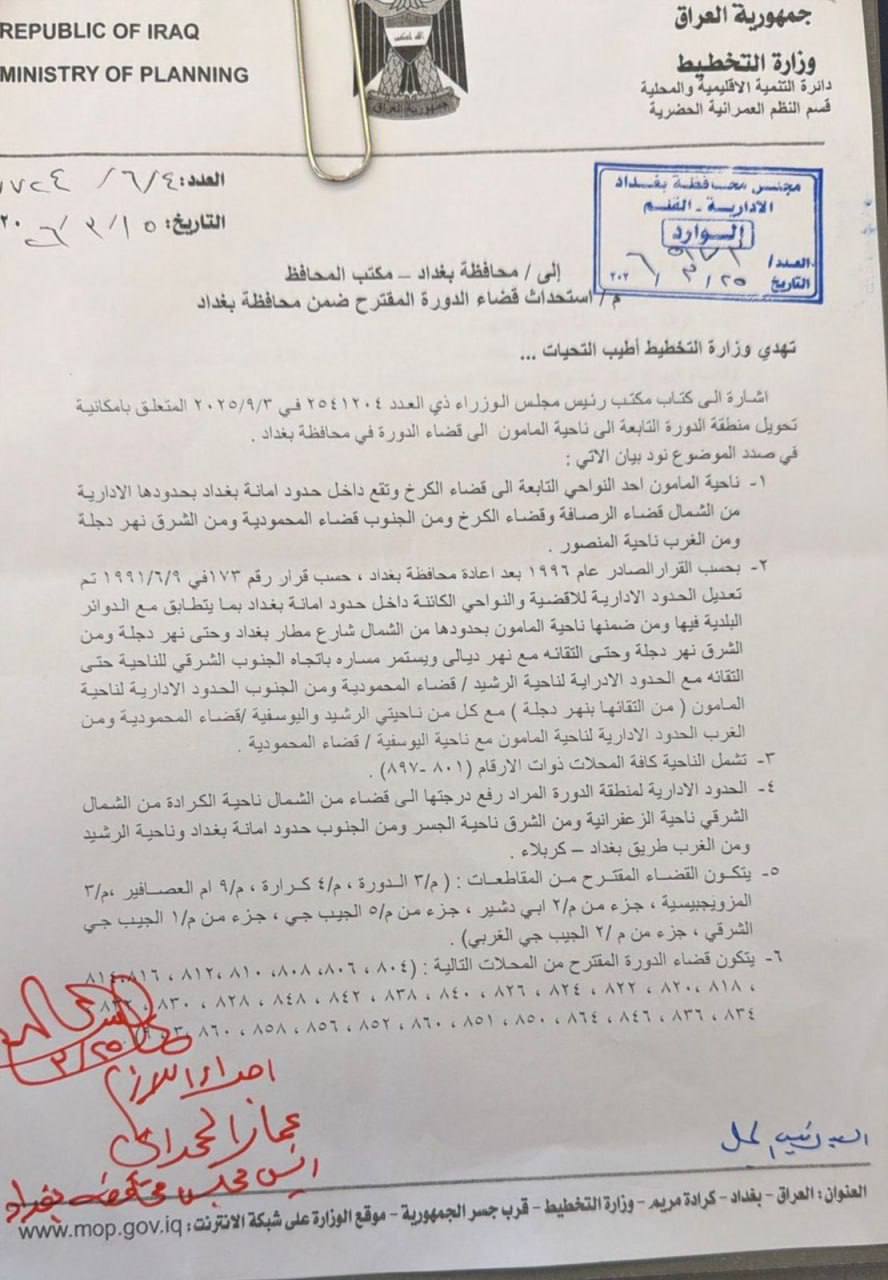 بالوثيقة.. مجلس محافظة بغداد يعلن استحداث قضاء الدورة الأربعاء, 25 مارس 2026, 22:53 محليات, يحدث الان أعلن مجلس محافظة بغداد،اليوم الأربعاء، استحداث قضاء الدورة ضمن الحدود الإدارية للعاصمة، استناداً إلى مخاطبات رسمية صادرة عن وزارة التخطيط. تابعونا عبر تليغرام