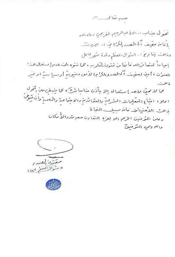 أصدر زعيم التيار الوطني الشيعي، السيد مقتدى الصدر، اليوم الأربعاء 25 آذار 2026، تخويلاً لإقامة مضيف آل الصدر في العاصمة اللبنانية بيروت اعتباراً من 6 شوال ولمدة شهر، مؤكداً عدم استغلال المضيف لأغراض دنيوية أو سياسية، ومشدداً على أنه لا يجوز استعماله إلا بإذنه الشخصي.