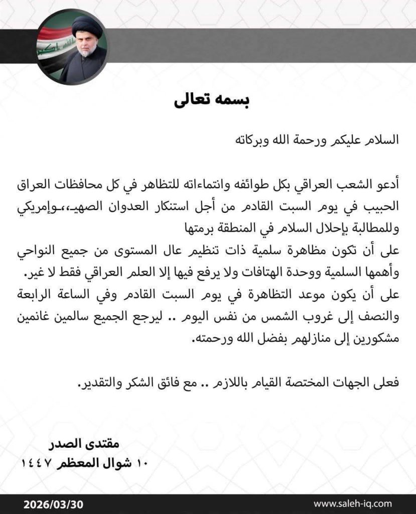 دعا زعيم التيار الوطني الشيعي السيد مقتدى الصدر، اليوم الاثنين، الشعب العراقي إلى التظاهر السبت المقبل لاستنكار العدوان الصهيوأمريكي.