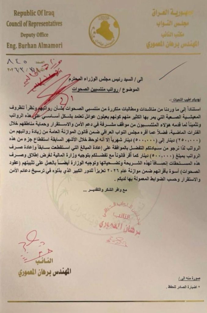بالوثيقة .. المعموري يعلن عن توجيه حكومي لإعادة صرف المبالغ المستقطعة من رواتب منتسبي الصحوات